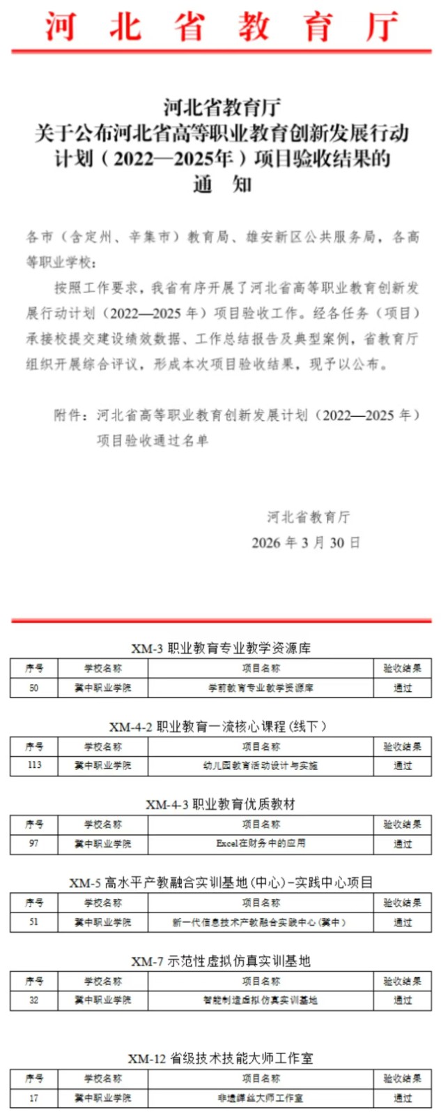 近日,河北省教育厅公布了《河北省高等职业教育创新发展行动计划(2022—2025年)》项目验收结果,我院申报的6个建设项目全部顺利通过验收。