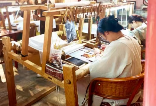 七年来,学院建成省级技术技能大师工作室,拥有300㎡专属实训场地与核心设备,构建集教学、实训、科研、社会服务于一体的综合性培养平台。创新推行“学员+学徒制”分层分类育人模式:对少数拔尖学生实施一对一学徒制,由非遗大师手把手带教,培育高精尖技艺传承人;对全体学生实行学员制规模化培养,普及缂丝文化、基础技艺与文创设计,培养非遗传播者与市场推广人才。