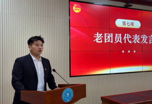 机电工程系俎天伟同学作为老团员代表分享了自身成长感悟,勉励新团员要珍惜团员身份,不断加强学习,积极投身志愿服务与校园建设,锤炼高尚品格,带动身边同学共同进步,让青春在不懈奋斗中绽放光彩。